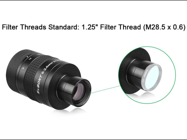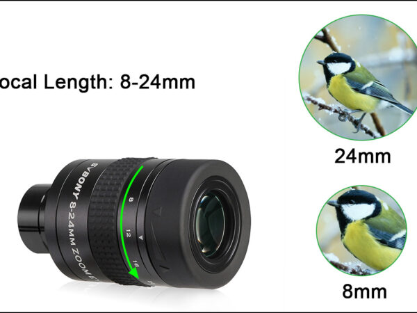 El clásico diseño con la mejor terminación es este ocular zoom de 8mm a 24mm de focal. Como siempre decimos, si bien los oculares zoom no pueden tener tanto campo o luminosidad como los oculares equivalentes de focales fijas, la ventaja de los oculares con ZOOM reside en poder variar la luminosidad y el contraste para una nebulosa, planeta, cúmulo o galaxia hasta encontrar su punto más cómodo en la observación. No nos va a importar tanto los aumentos como el campo y la luminosidad que se traduce en comodidad, de acuerdo a nuestra dilatación de pupila, si usamos o no dioptrías en nuestro anteojos o lentes de contacto, etc.