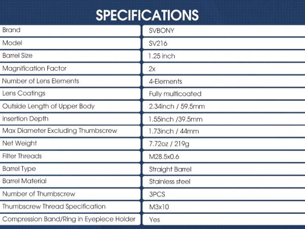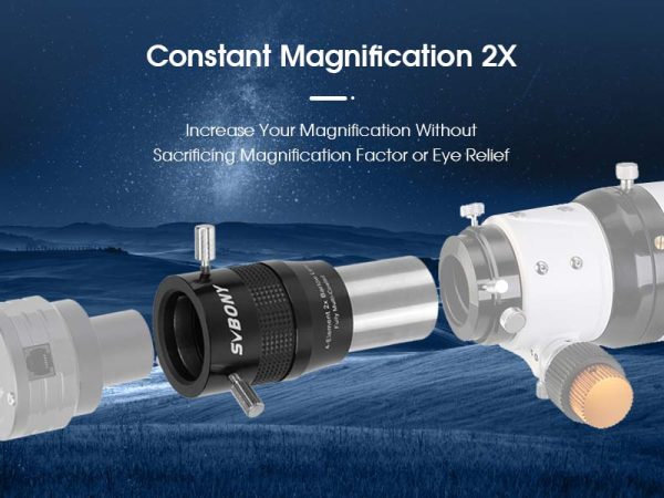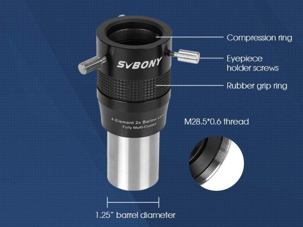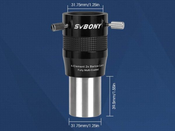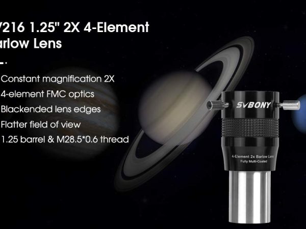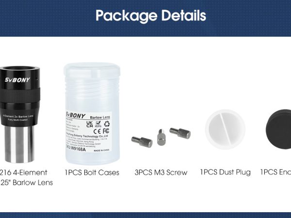 Las 4 lentes de la lente Barlow SV216 tienen un revestimiento mejorado completamente multicapa, lo que hace que la imagen sea brillante y nítida. Los bordes de la lente están ennegrecidos para eliminar la dispersión de luz interna para maximizar el contraste de la imagen;