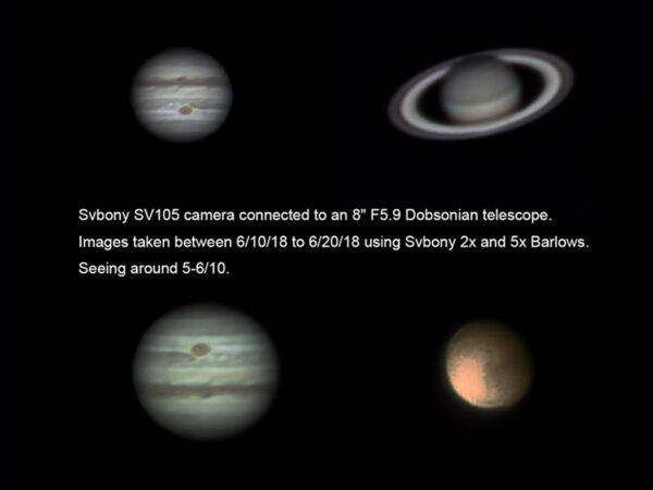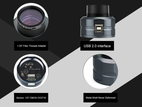 La cámara planetaria Svbony SV105 funciona con sistemas Windows, Linux, Mac OS y Android. De sensor CMOS y tamaño de pixel de 3 micrones, te asegura estar por encima de la mancha de difracción, ser luminosa y además con excelentes resultados en focales largas, ideal para pequeños Maksutov y Refractores F/10, Reflectores de 76mm, 130 y 114mm. Aprovechas el potencial de tu telescopio para imágenes ultra-nítidas de planetas, manchas solares (con el filtro apropiado) y superficie Lunar. También por su tamaño de pixel y sensibilidad podes usar la como guiadora con aperturas de telescopios guias de 50 a 70mm. Compatible para usar con tu celular en ANDROID y con SharCap en Windows, (además de los softwares indicados para Apple y Linux) te abre toda una gama de posibilidades de conectividad que hará que por muchos años tu cámara sea compatible con muchos sistemas operativos. Su «housing» (carcaza) metálico de alta calidad en duroaluminio te asegura su protección, viene con el adaptador para colocar en tu porta ocular de 1,25″ y el cable USB 2.0 de conexión a PC.