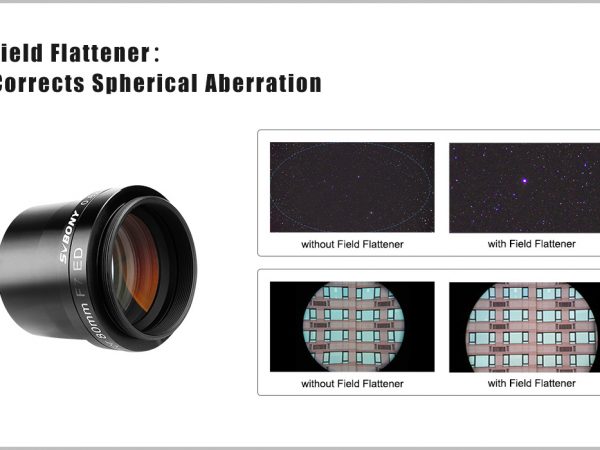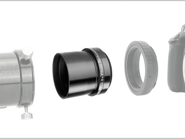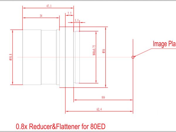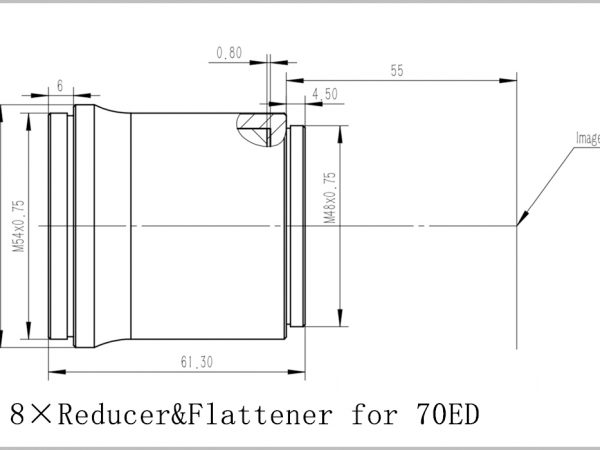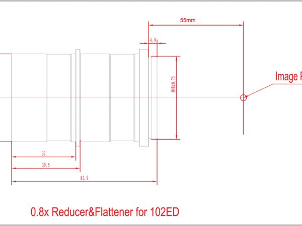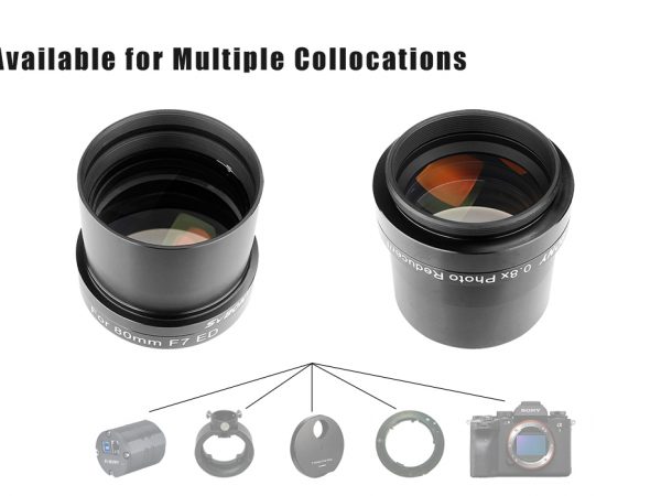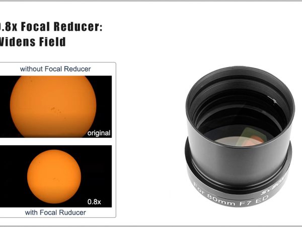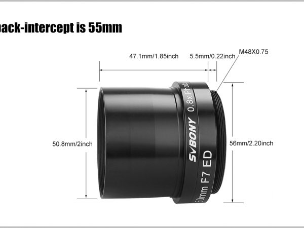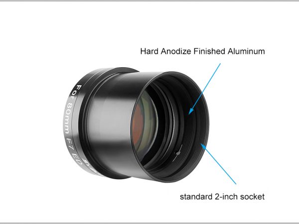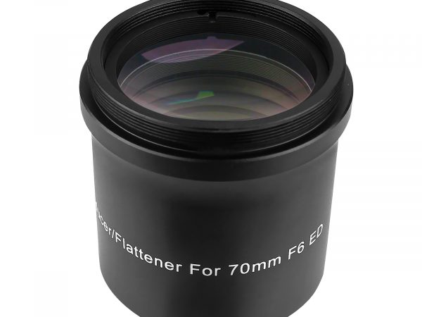Óptica multicapa alojada en alto brillo y cuerpo de aluminio con acabado anodizado duro para ayudar a reducir el peso. El extremo de la cámara del reductor/aplanador tiene roscas M48x0.75 para conectar a la bayoneta de la cámara (compatible con cámara de marco completo), mientras que el lado del telescopio es estándar de 2 pulgadas para conectar a la lente principal, también incluye un filtro estándar de 2″. hilo para agregar el filtro de contaminación lumínica que necesita. El enfoque posterior predeterminado es de 55 mm. El extremo frontal del telescopio de 70 mm es un enchufe M54x0.75 para conectar a la lente principal.