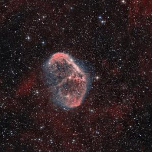 La nebulosa Media Luna (imagen junto a las del producto) también conocida como NGC 6888, Caldwell 27, Sharpless 105) fue fotografiado por Chris Sullivan con un N208CF con el Corrector de Coma recomendado. Es una nebulosa de emisión en la constelación de Cygnus, a unos 5000 años-luz de la Tierra. Fue descubierta por Friedrich Wilhelm Herschel en 1792. [2] Está formada por un rápido viento estelar de la estrella Wolf-Rayet WR 136 (HD 192163) cuando se convirtió en una gigante roja hace alrededor de 250.000 a 400.000 años. El resultado de la colisión es como un domo y dos ondas de choque, uno en movimiento de ida y un movimiento hacia el interior. La onda de choque se mueve hacia el interior, calienta el viento estelar a temperaturas emisor de rayos-X.