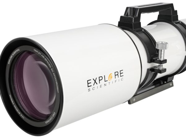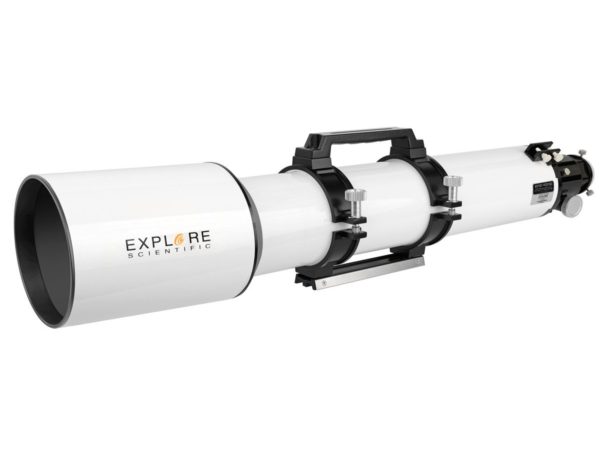 Explore Scientific ED127 Classic White f/7.5 Air Spaced Triplet with Hoya FCD100 optics and Integrated Dew Shield; 952mm focal length; 2.5″ HEXagonal Rack and Pinion 10:1 two-speed Focuser Cradle Ring with Handle and Vixen Style Dovetail Plate; Explore Finder Scope Base installed on scope; 99% Reflective 2» Diagonal. Dew shield diameter: 217.5mm. Weighs 18lbs. (Case and Finder Scope NOT Included)