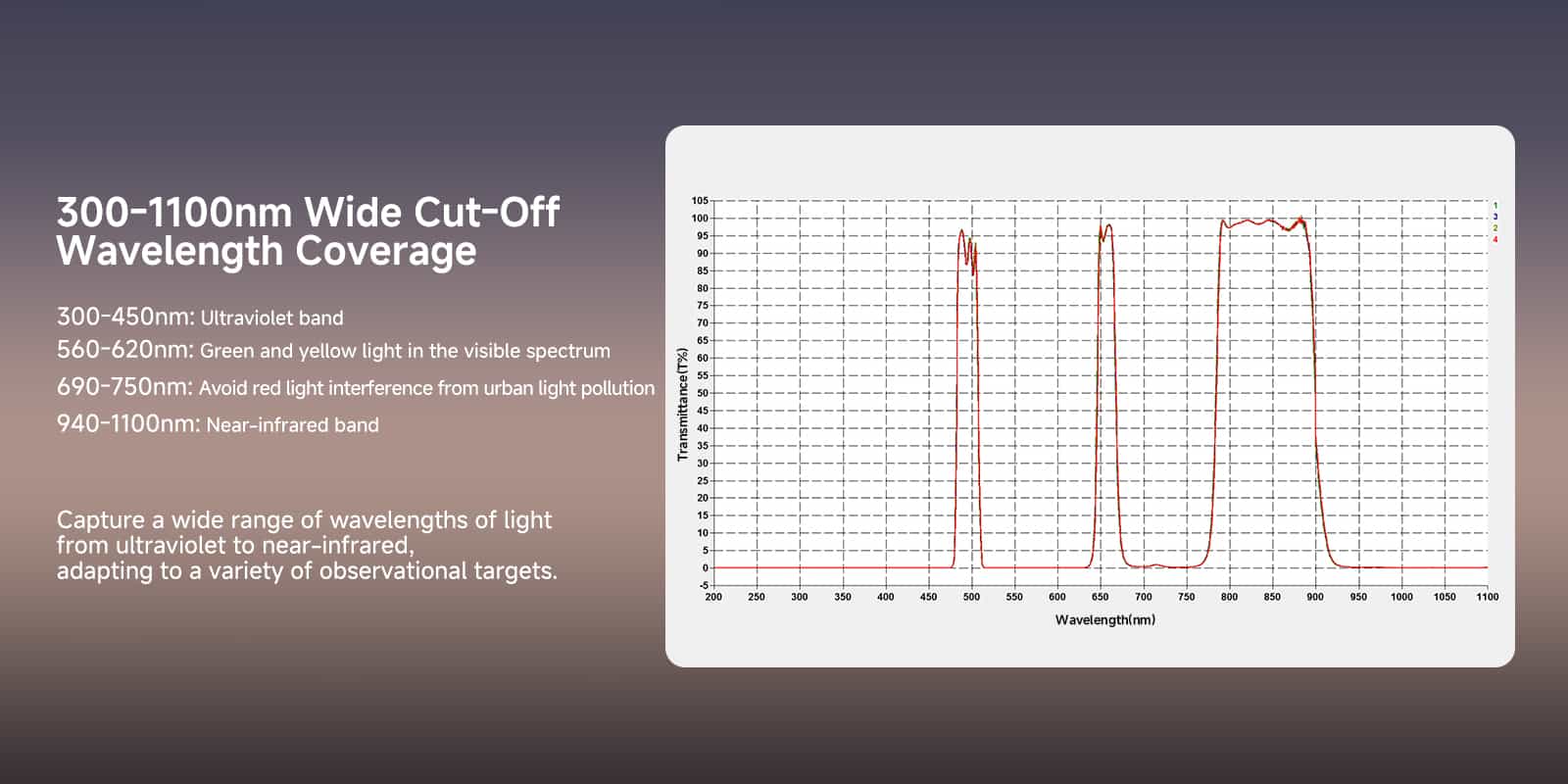Alta transmitancia: Con una transmitancia >90% en la longitud de onda central de Ha, OIII y H-Beta, este filtro multibanda le permite capturar más objetos para su astrofotografía.
