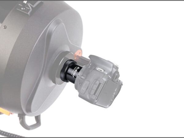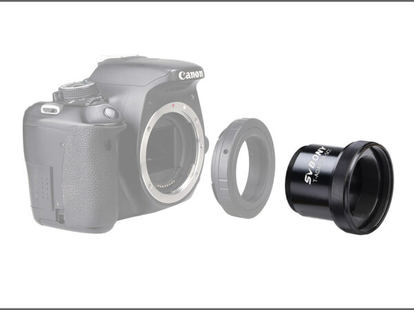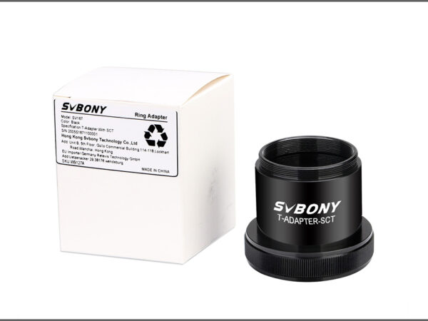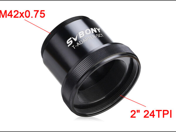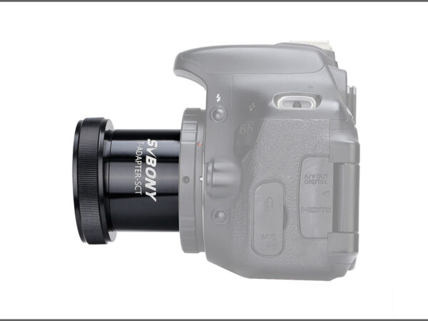 SVBONY SV167 es un adaptador en T que conecta una cámara SLR o DSLR a un SCT para fotografía de foco primario. Las roscas en T aceptan el anillo en T específico de la marca de la cámara (se vende por separado). Telescopio compatible de adaptador: Celestron 5SE / 6SE / 8SE / C5 / C8 / C9.25 / C11 / C14 y todos los telescopios SCT de 2 », 24TPI